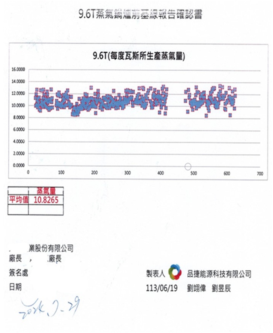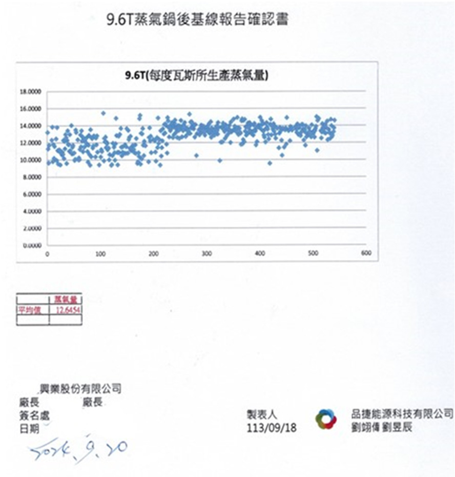 每年節省瓦斯費計算: 紡織廠9.6T 蒸汽鍋爐: 安裝後瓦斯費用約為16.8% 月省瓦斯費約: 130萬-108萬=22萬元 年省瓦斯費約: 22萬元*12個月=264萬元 減少碳排放量概算: 每月減少天然氣用量約18,500度。 2024年環境部公告天然氣每立方米約為2.63kg碳排放量 18,500 *2.63*12(月)=583.8公噸 (年減少碳排放量) 紡織廠二台蒸氣鍋爐 二台鍋爐合計:年減1057公噸碳排放